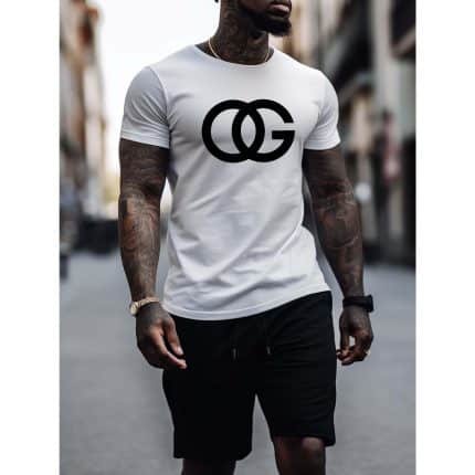 100% Cotton Plus Size Set: “OG” Crossing Letter Graphic Print T-Shirt for Summer, Men’s Thin Casual Shorts with Zipper Pockets